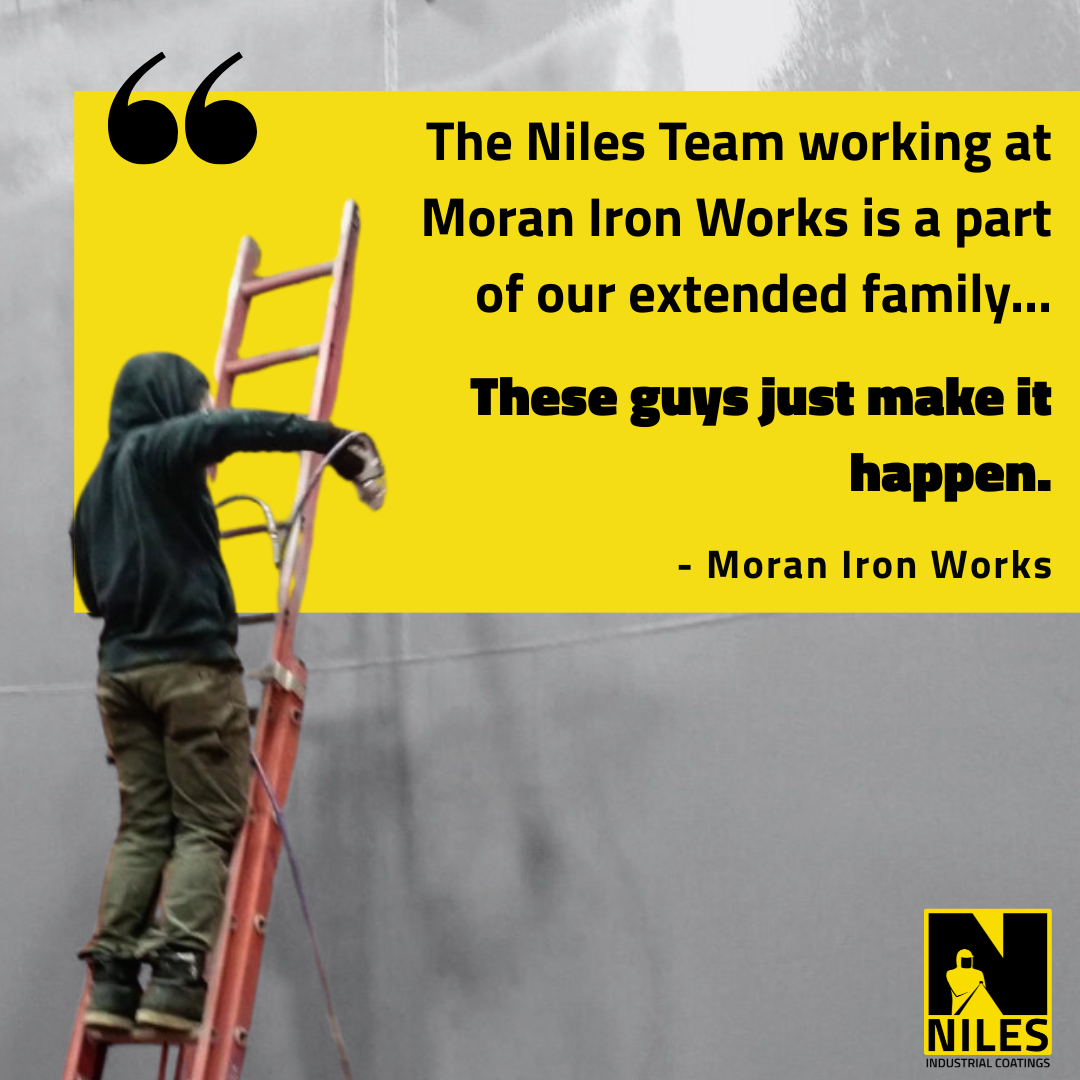 “The Niles team working at Moran Iron Works is a part of our extended family. We rely on them to do some of our toughest coating projects. Working whatever hours, or whatever days, these guys just make it happen.”